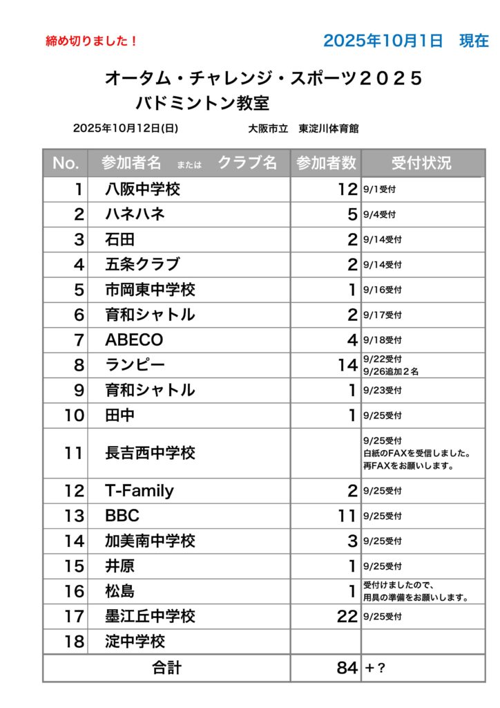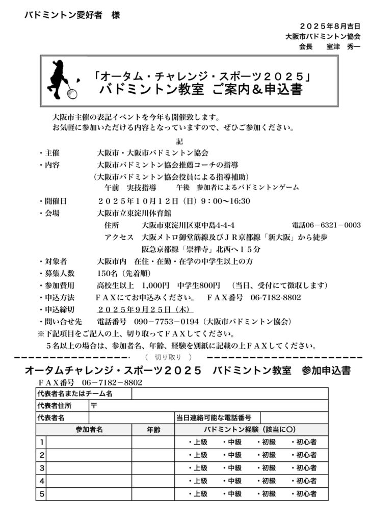 申込み人数と参加一覧に相違がある場合は、大阪市バドミントン協会まで、連絡をお願い致します