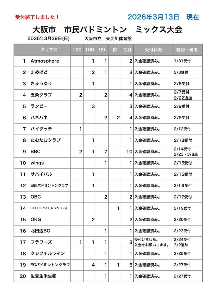 申込み組数と参加一覧に相違がある場合は、大阪市バドミントン協会まで、連絡をお願い致します。