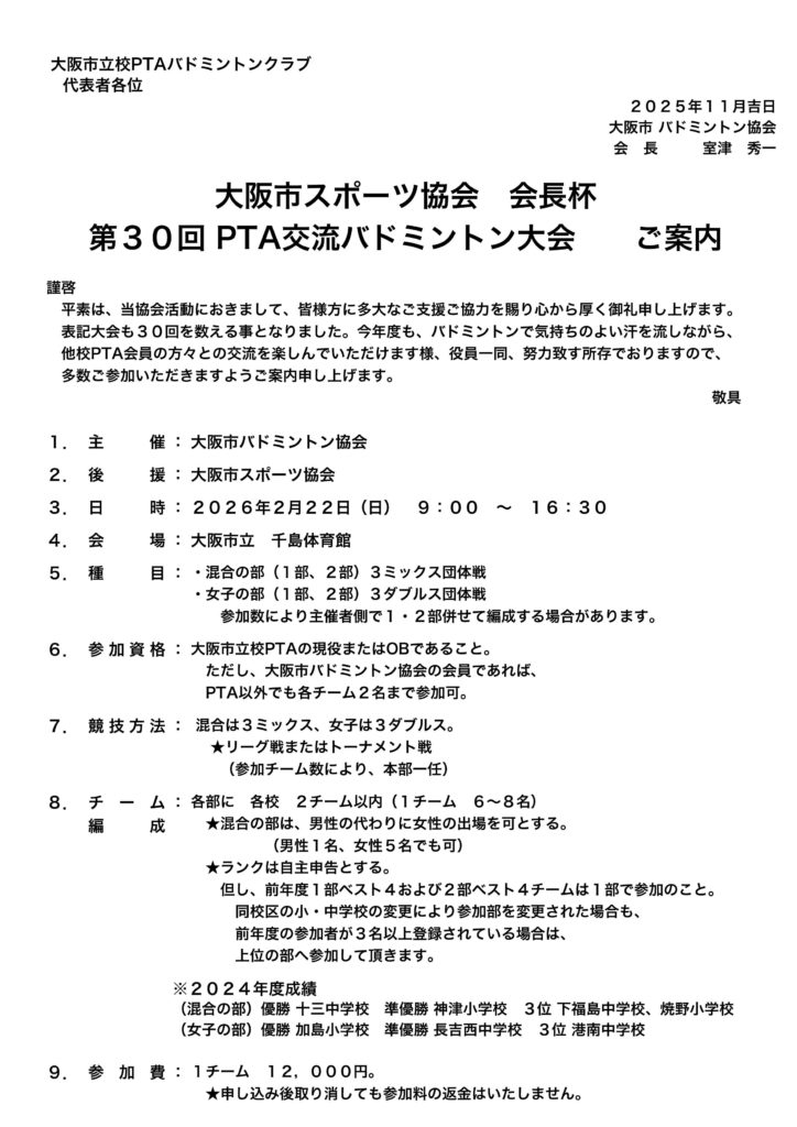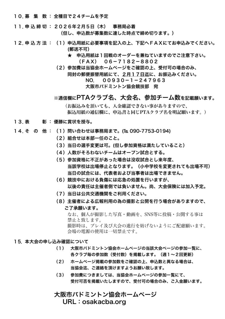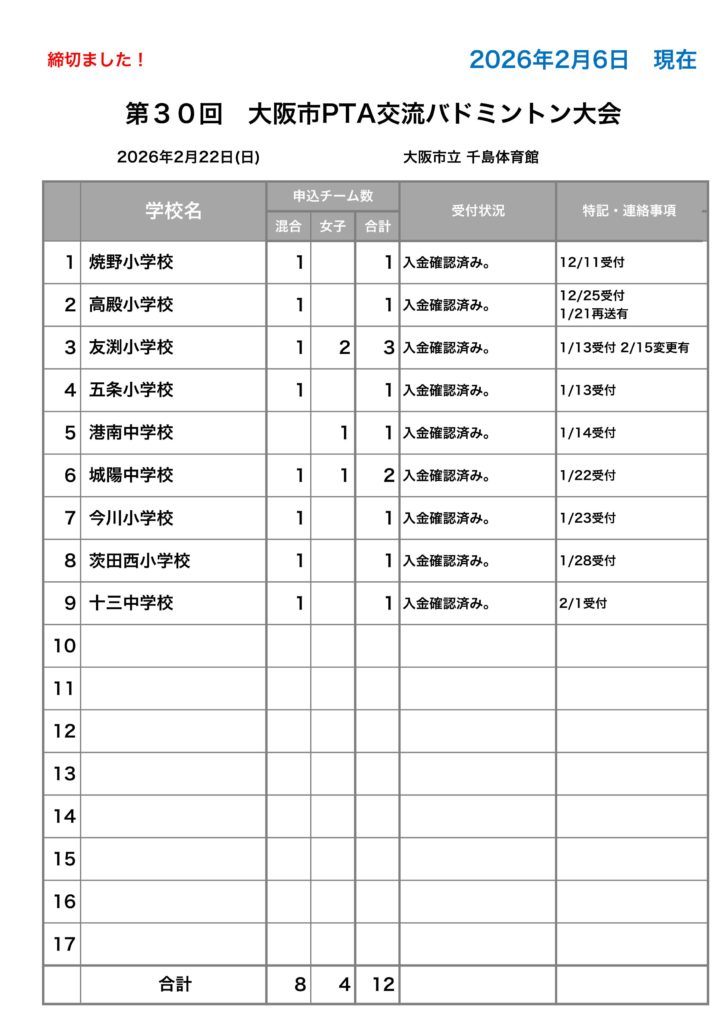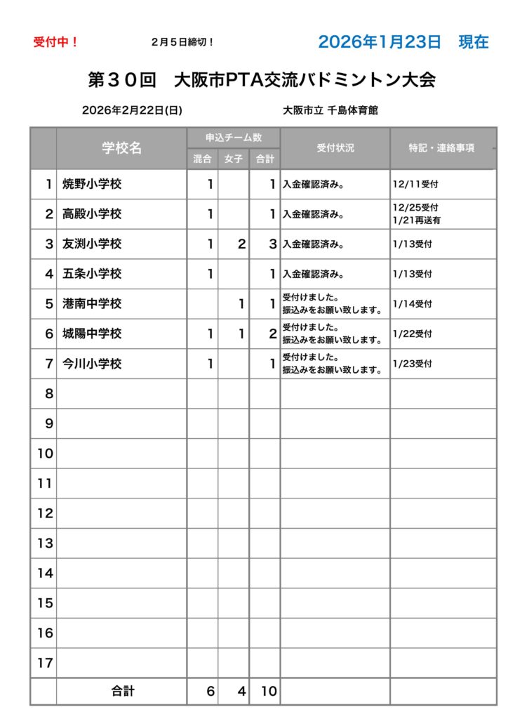 申込みチーム数と参加一覧に相違がある場合は、大阪市バドミントン協会まで、連絡をお願い致します。